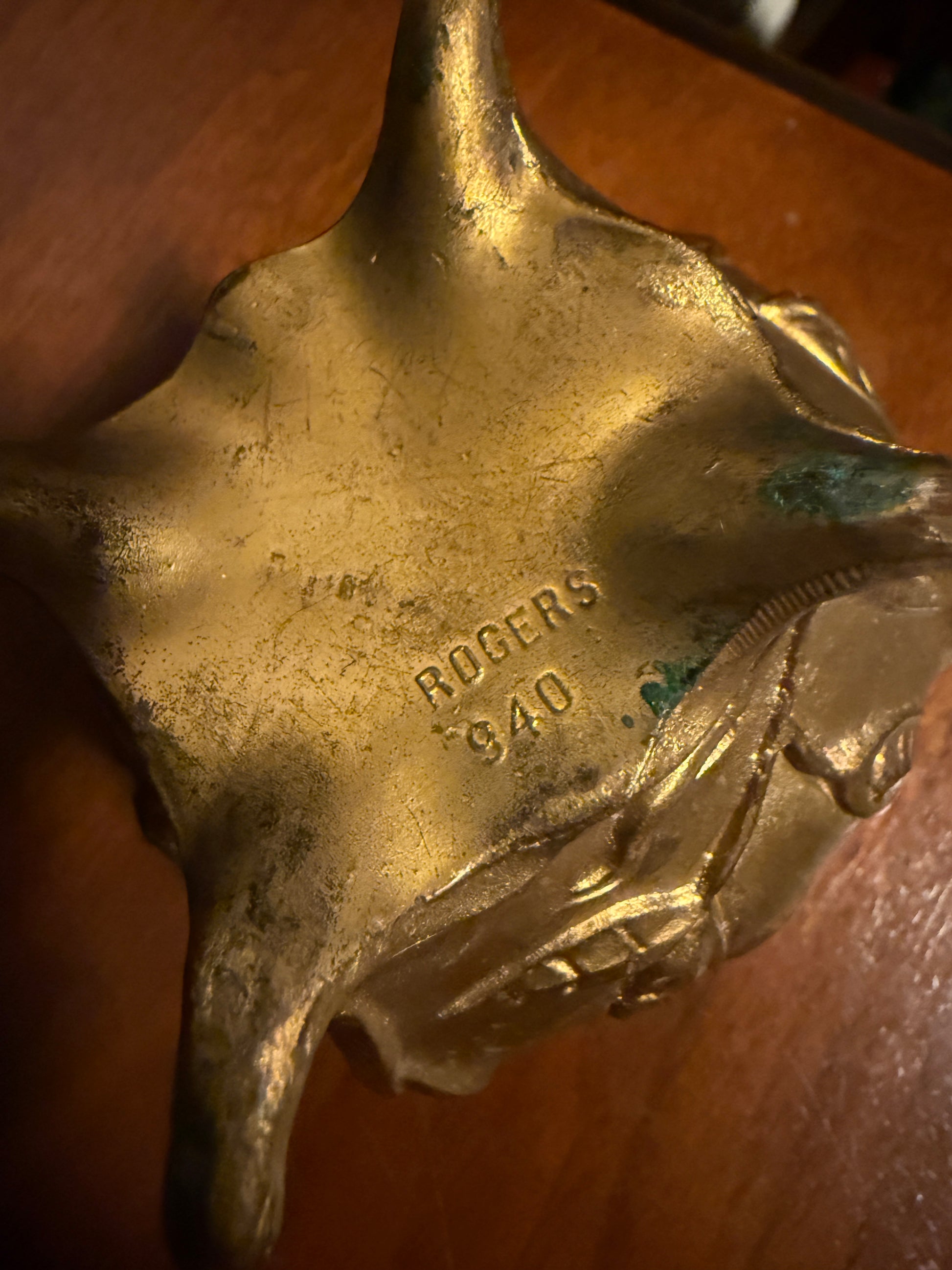 Bring a touch of golden melancholy to your vanity with this exquisite Art Nouveau jewelry casket by Rogers, crafted in the early 1900s. Cast in gilt metal with organic flowing lines and delicate leaf motifs, it embodies the romantic artistry of the Belle Époque — a time when even the smallest treasures were kept in sculptural form.