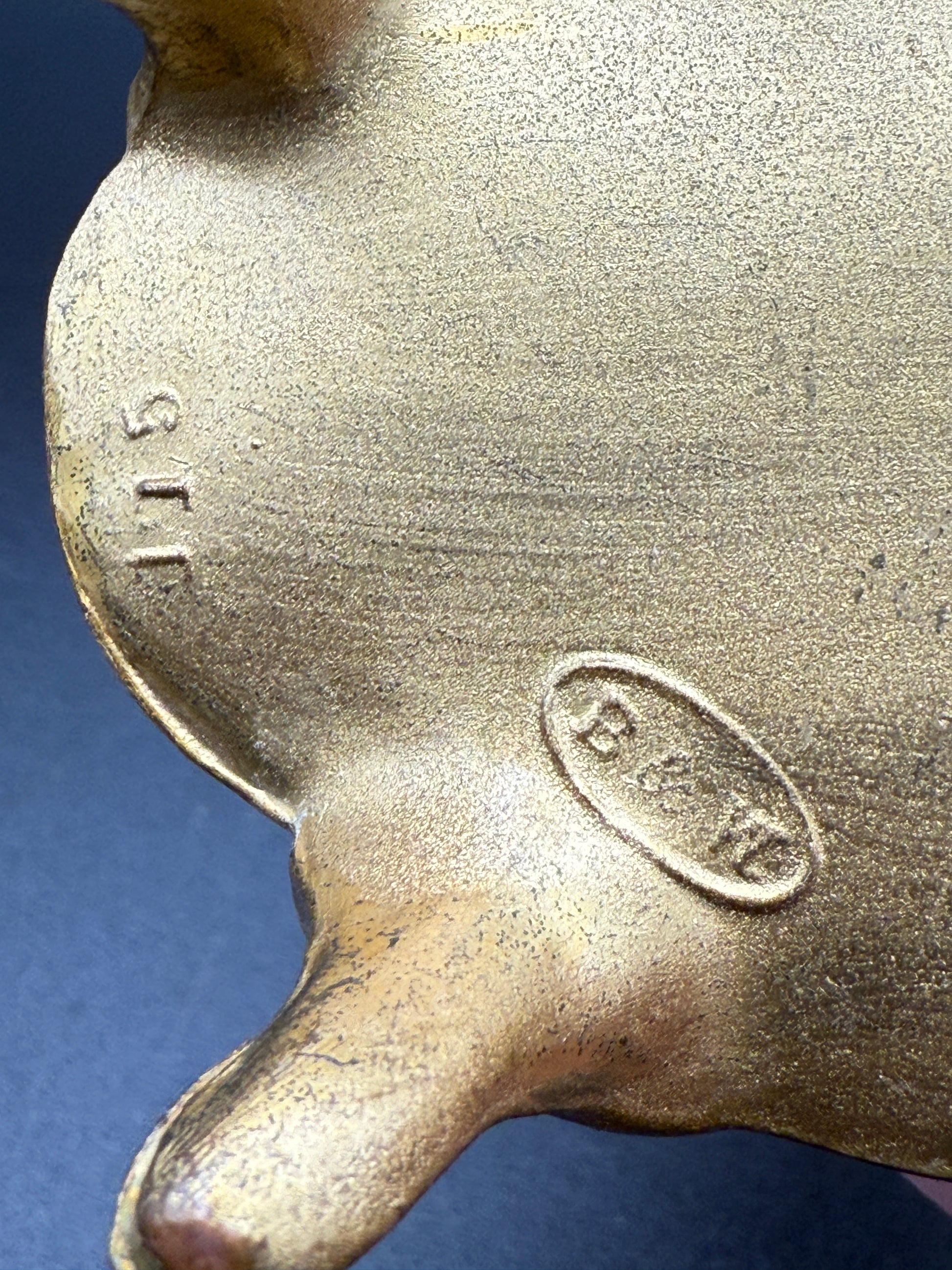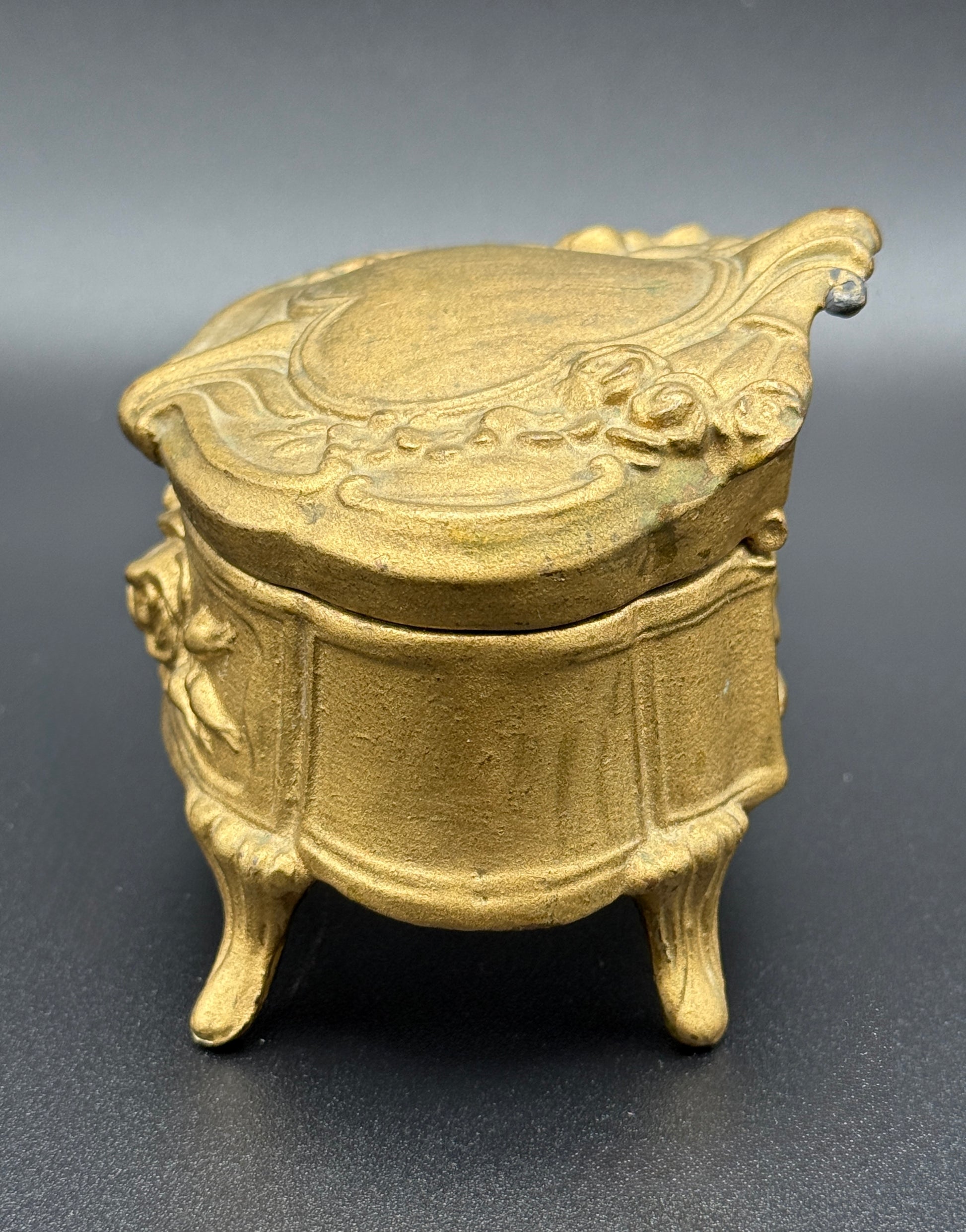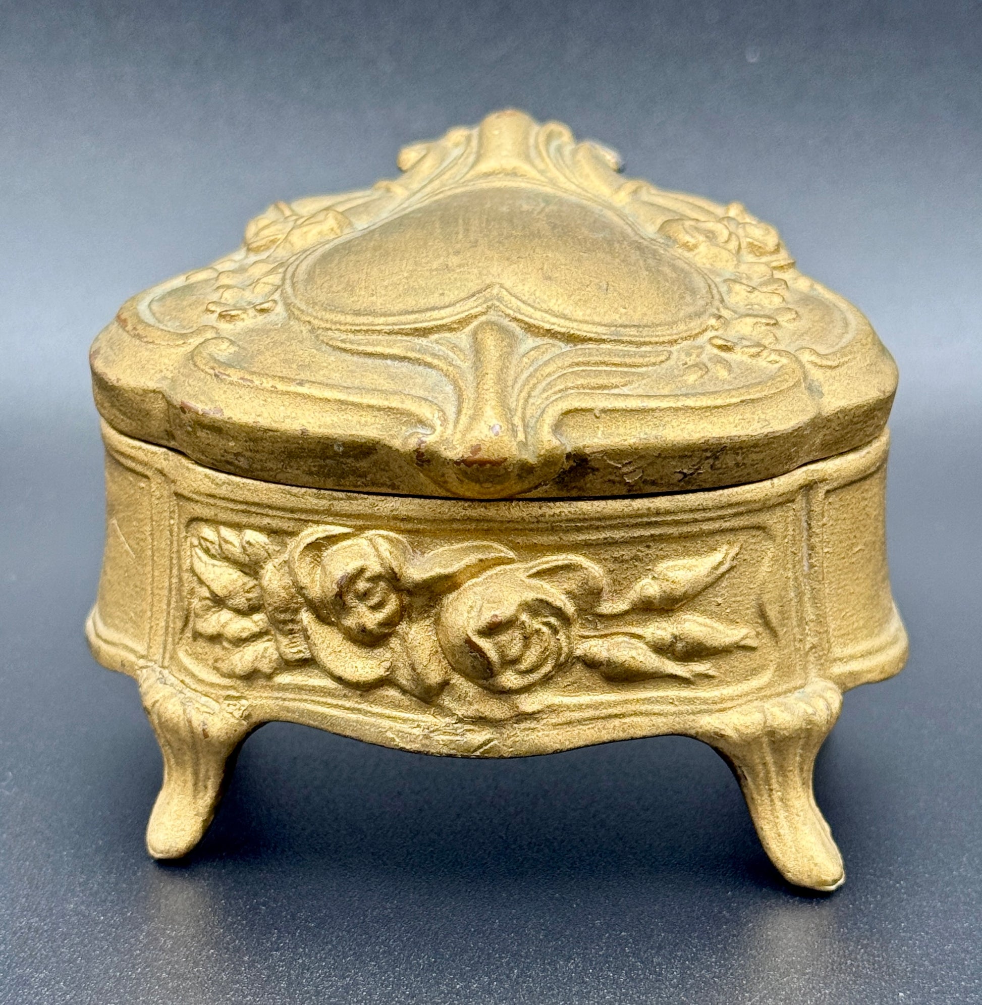 This gilded metal jewelry casket, made by B&W (Benedict & Wieners Co.) around 1900–1915, embodies the romantic Art Nouveau era. Cast from spelter with a warm golden finish, it features a heart-shaped lid adorned with raised floral and scrollwork motifs and stands gracefully on cabriole legs. The original silk lining remains intact, delicately aged and a testament to its history. The underside is clearly marked “B&W 115.”