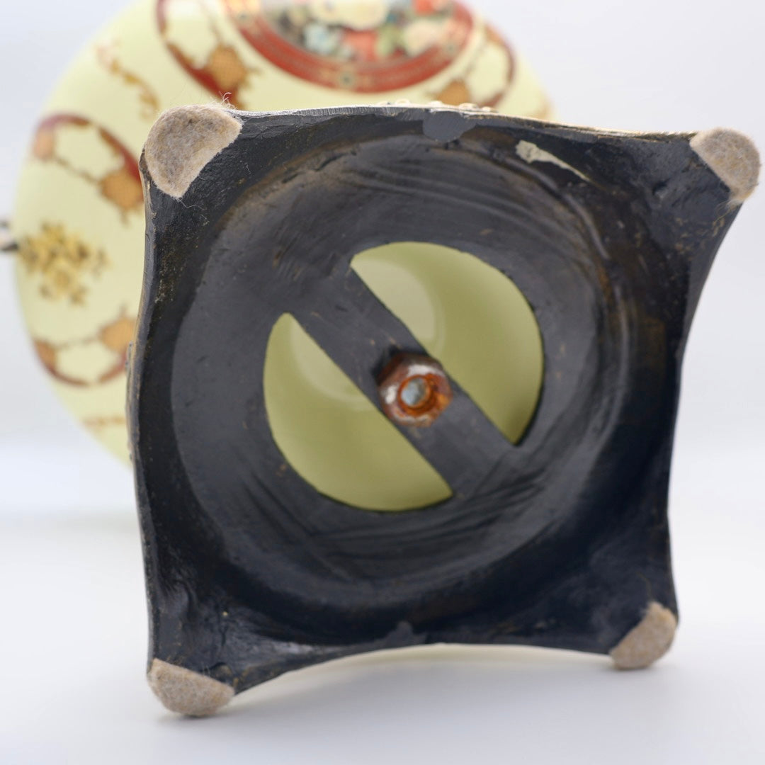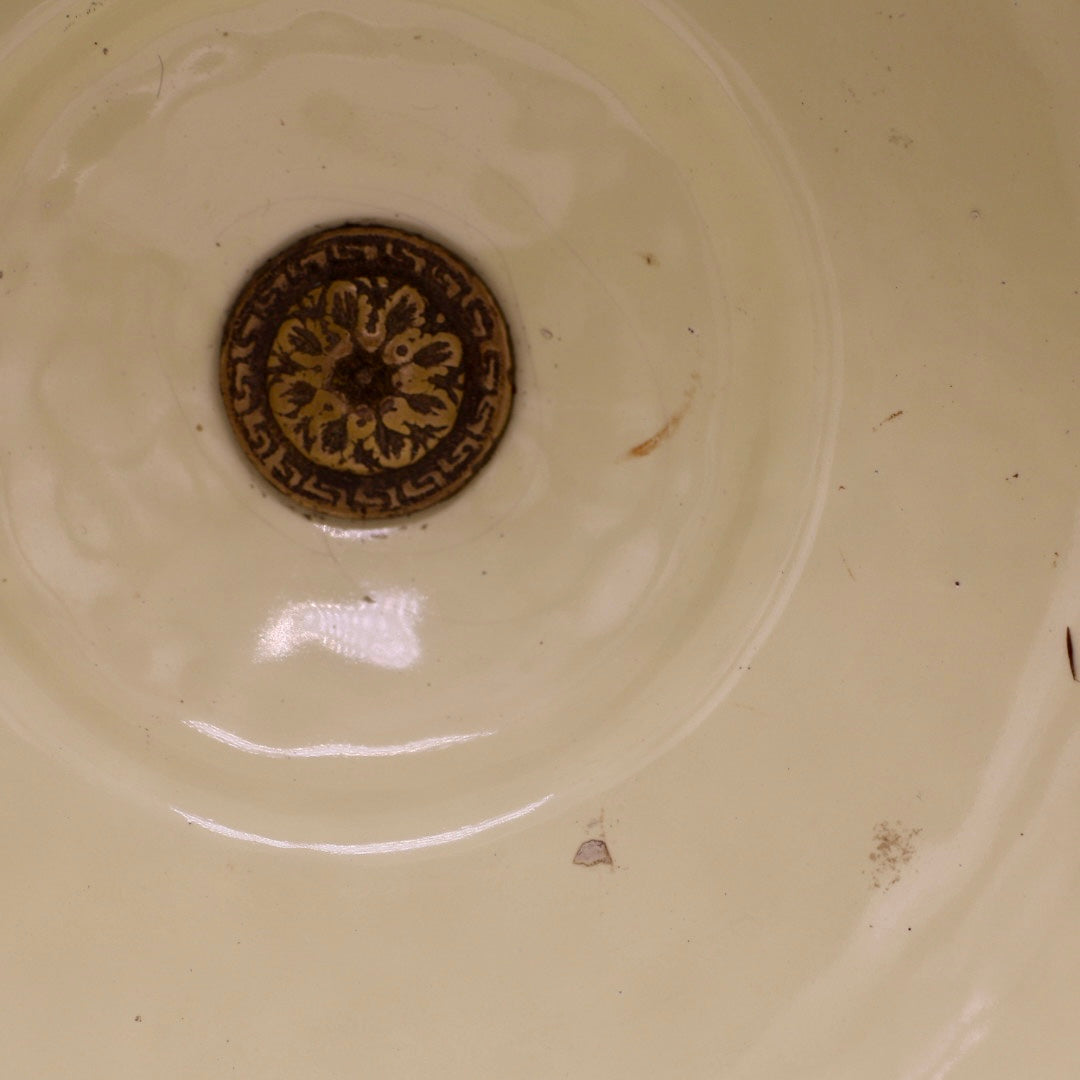 - Condition: Good vintage condition with expected light wear consistent with age. One small chip inside the bowl and a minor indent; neither limits the appeal (see photos). NOTE: Handles are intact but delicate and pliable. In order to preserve the piece as original, it is recommended not to lift the piece by the handles.