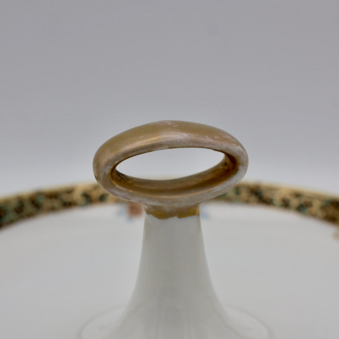 The dish is crafted from fine porcelain and features an oval loop handle with light wear to the original gold gilding, consistent with age. The border design retains excellent color and detail, making it a lovely example of early 20th-century Japanese export porcelain.