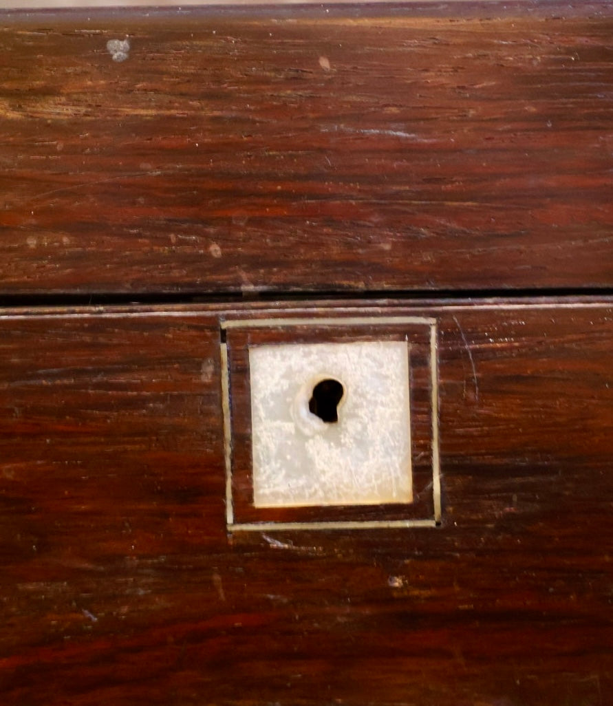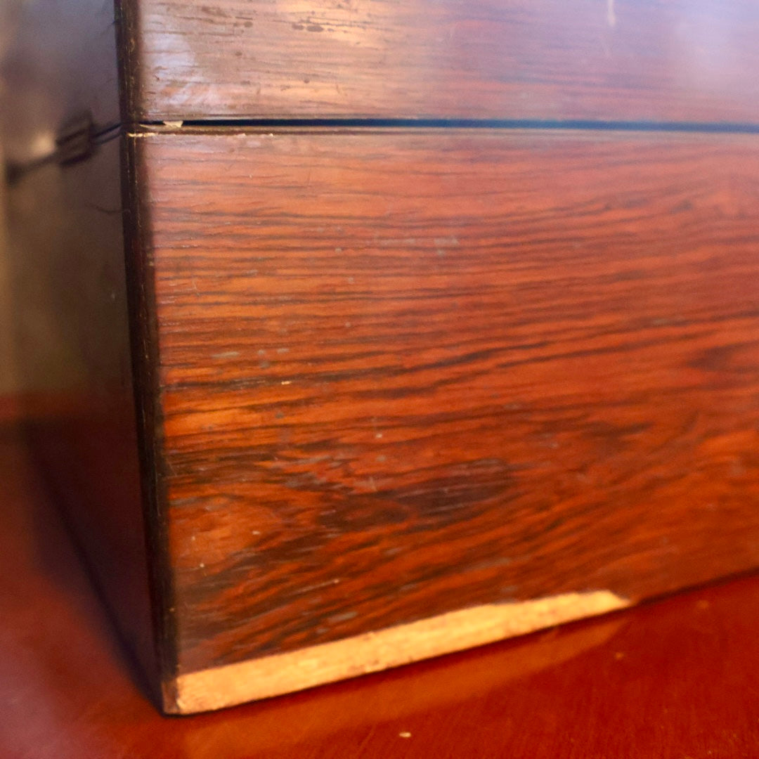 The rosewood exterior shows honest antique wear throughout, including surface scuffs, a scraped corner, and a missing strip of wood along the lower edge, all consistent with over a century of use. The exterior lock is non-functional, which is typical for travel boxes of this period. The underside retains remnants of its original protective fabric lining.
