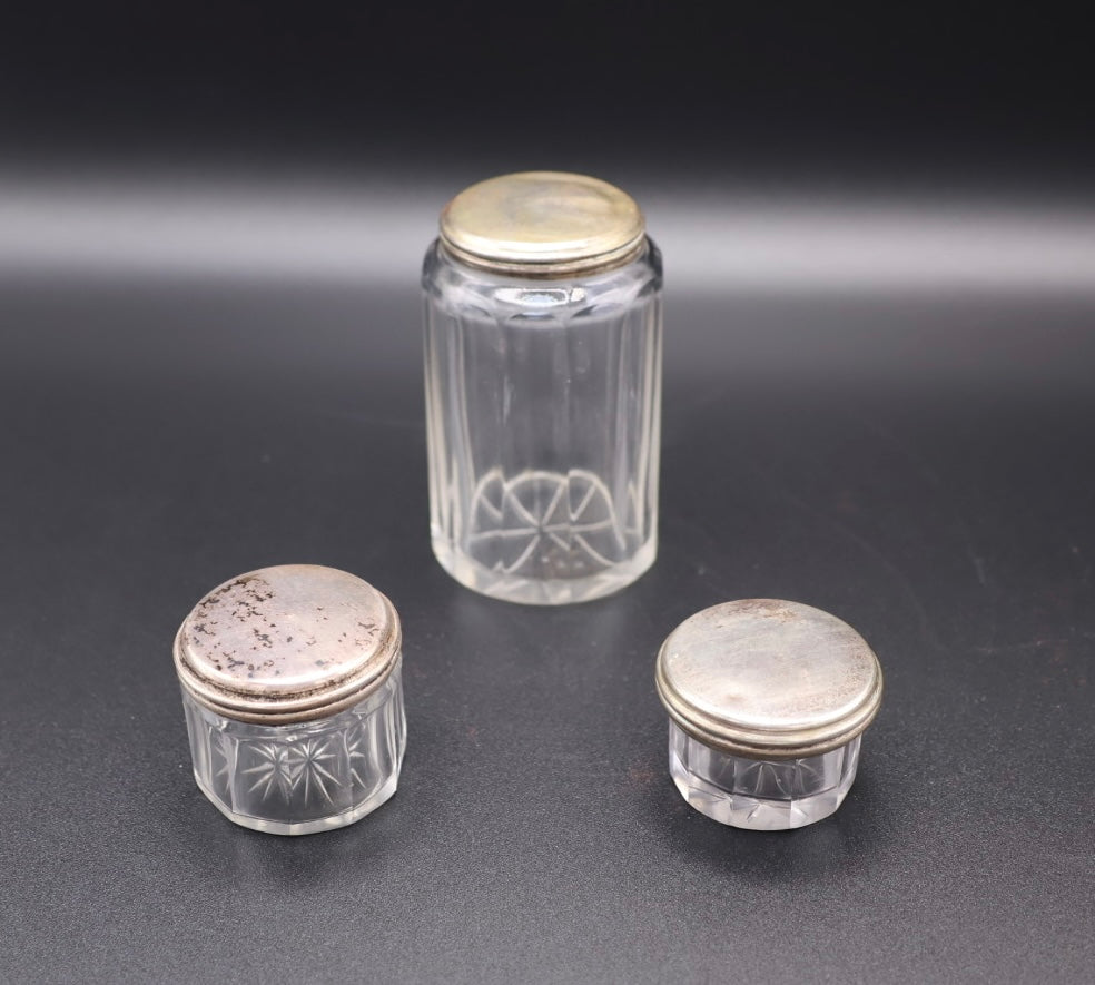 - Silver-tone lids show natural patina