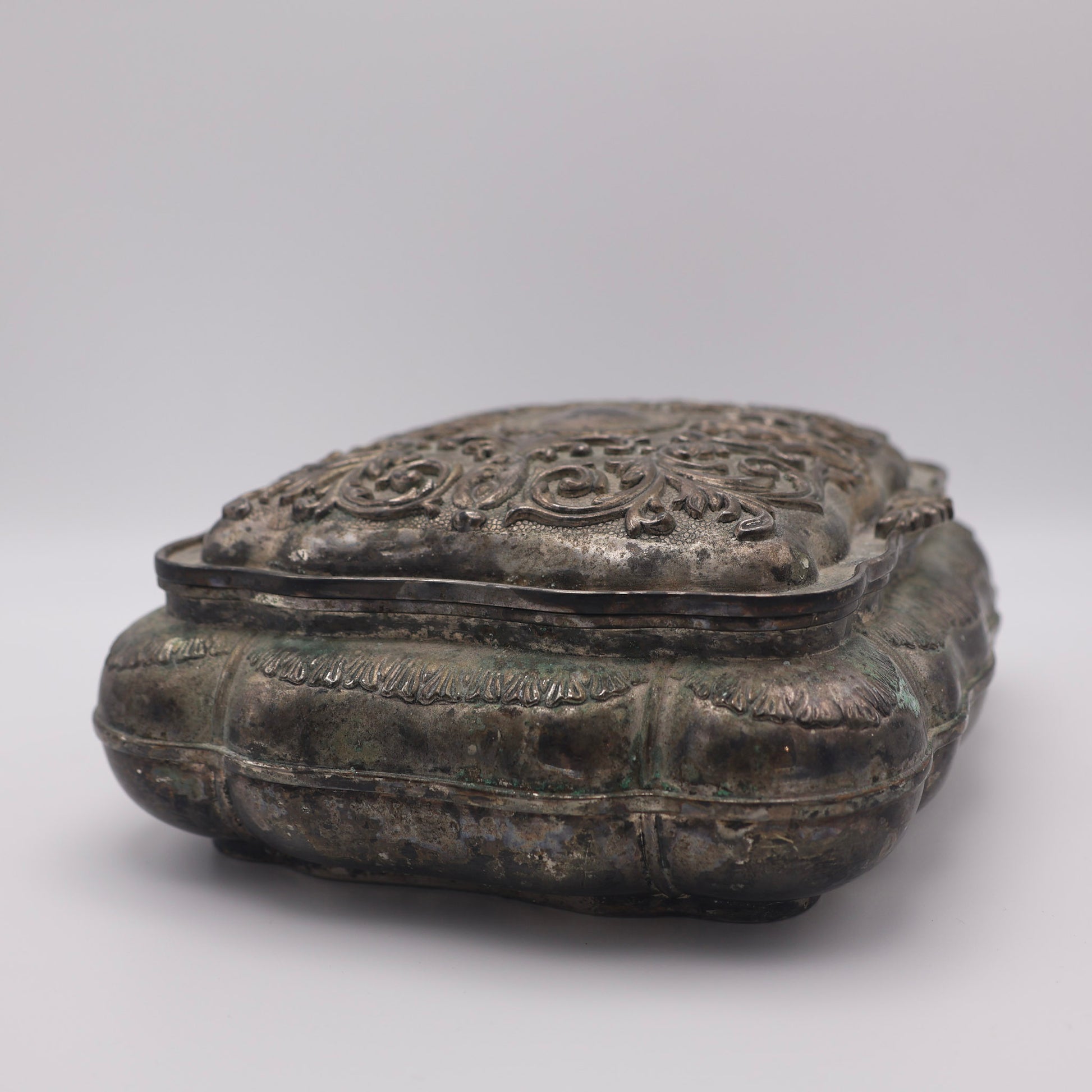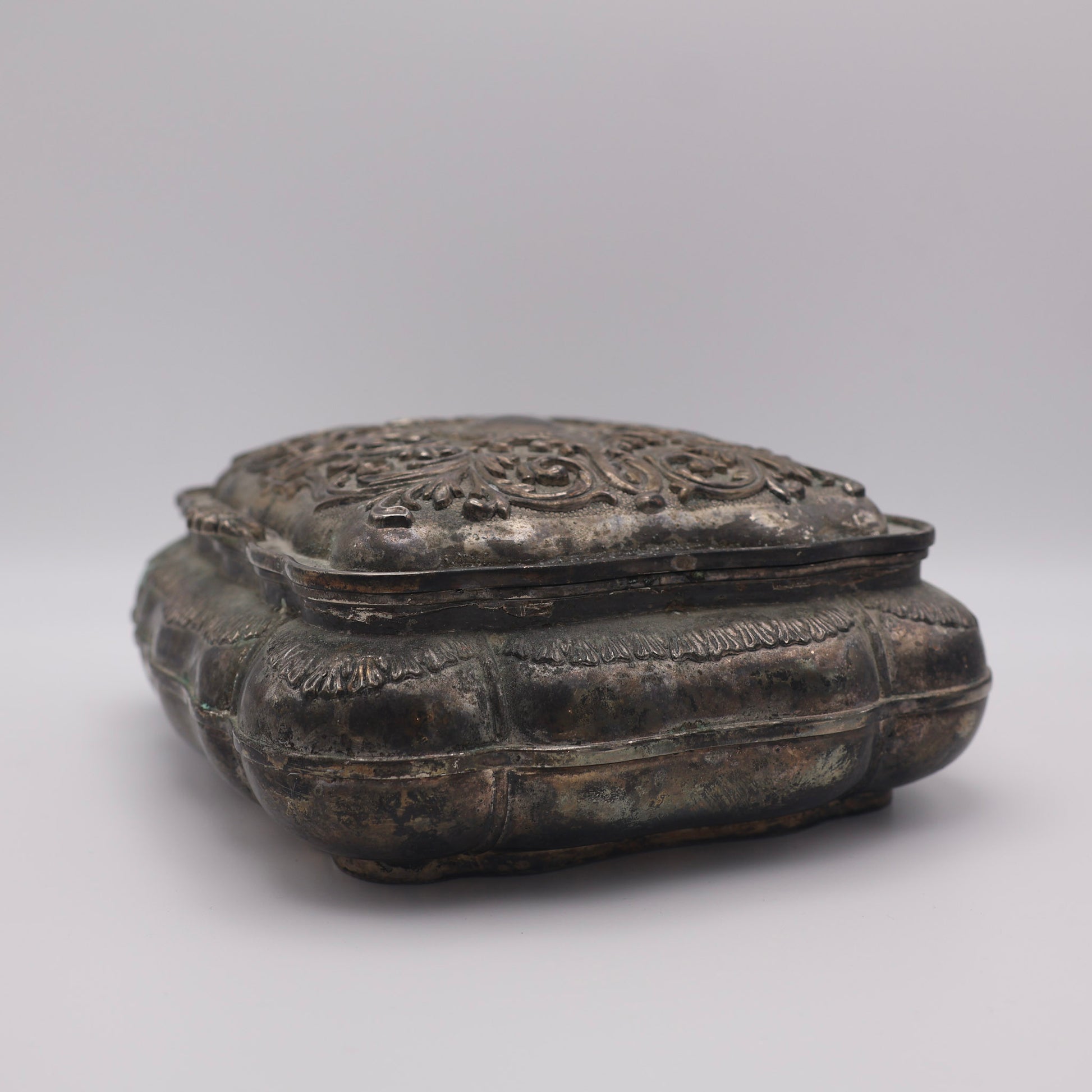 This antique jewelry casket box is beautifully crafted from heavy metal with a silver-plated finish. It features an ornate raised design of scrolling foliage and floral motifs on the lid and sides. The interior is lined with a removable plastic based red velvet liner, which was designed as a replacement. This jewelry box reflects Victorian and Rococo Revival styles, with its decorative repoussé details, scalloped edges, and sturdy construction.