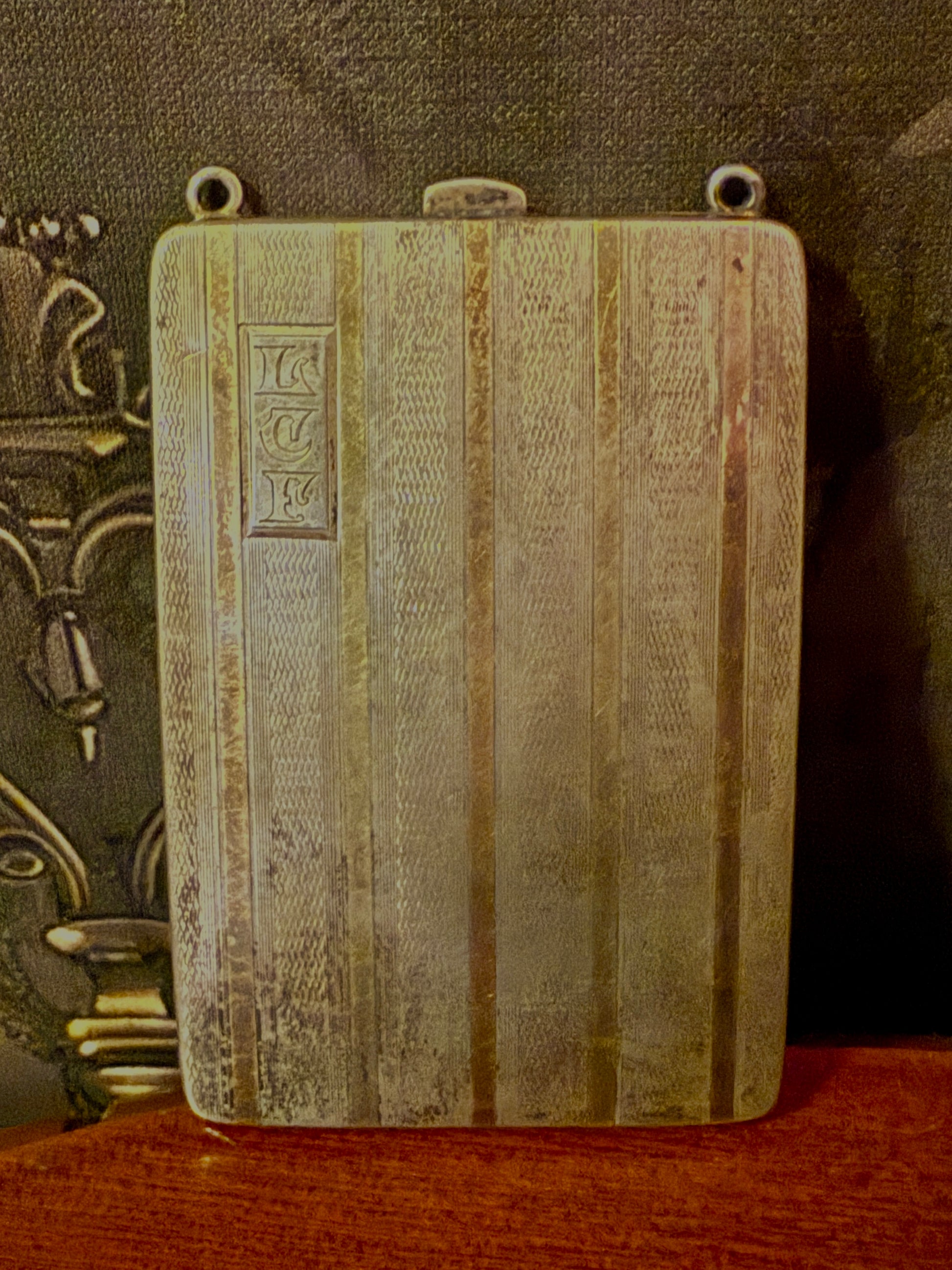 A finely made antique sterling silver coin compact purse, featuring 10K gold inlay striping and an engraved monogram cartouche on the front. This style of compact purse was widely produced in the early 20th century by multiple American silver manufacturers.