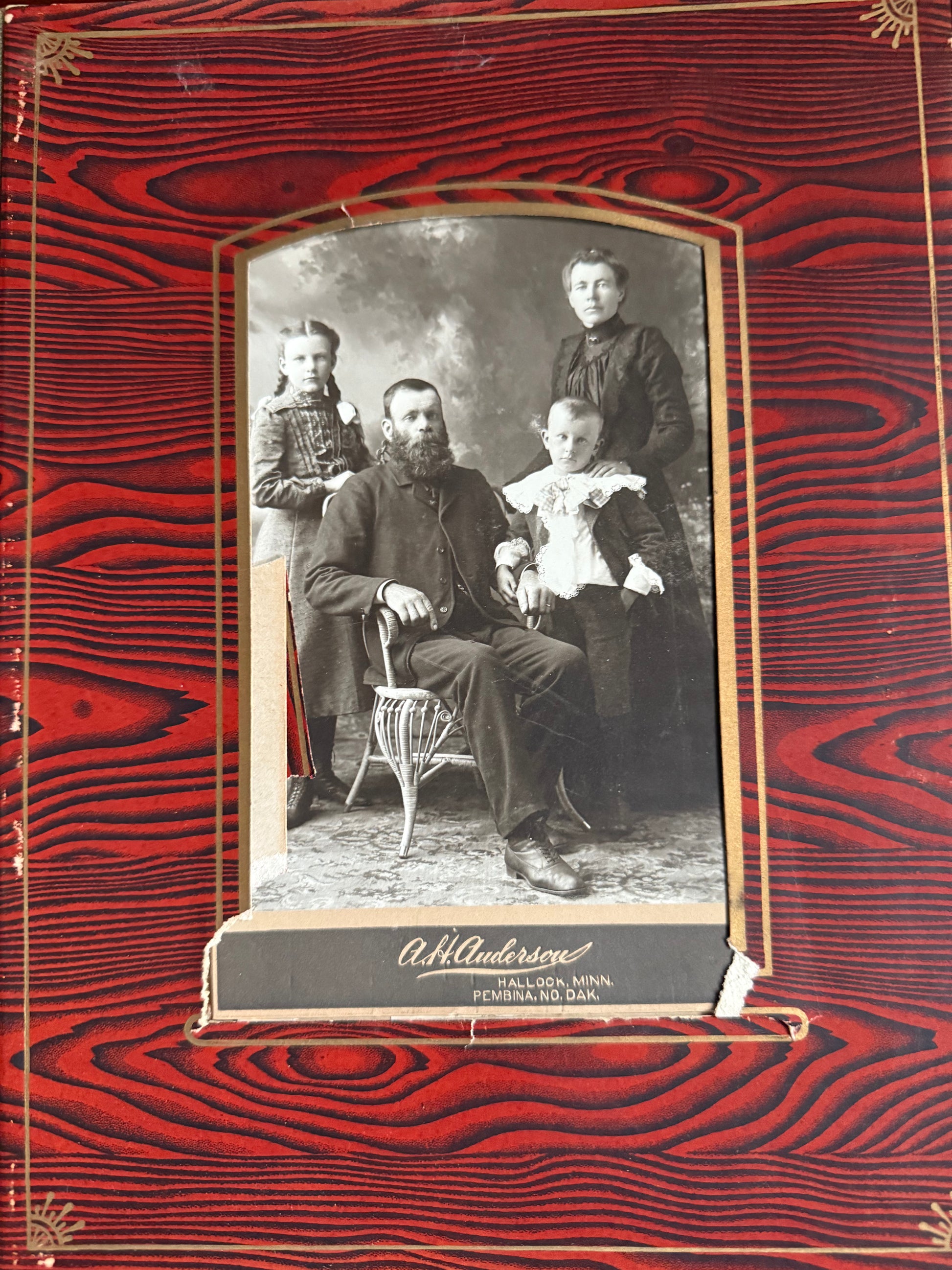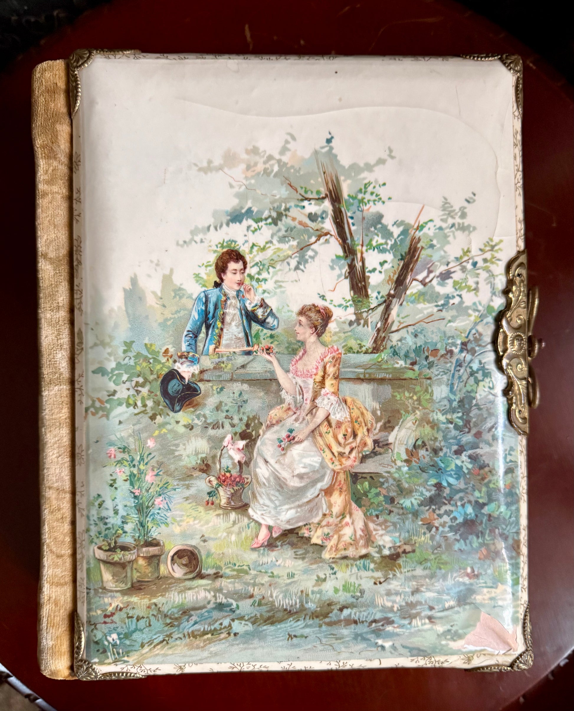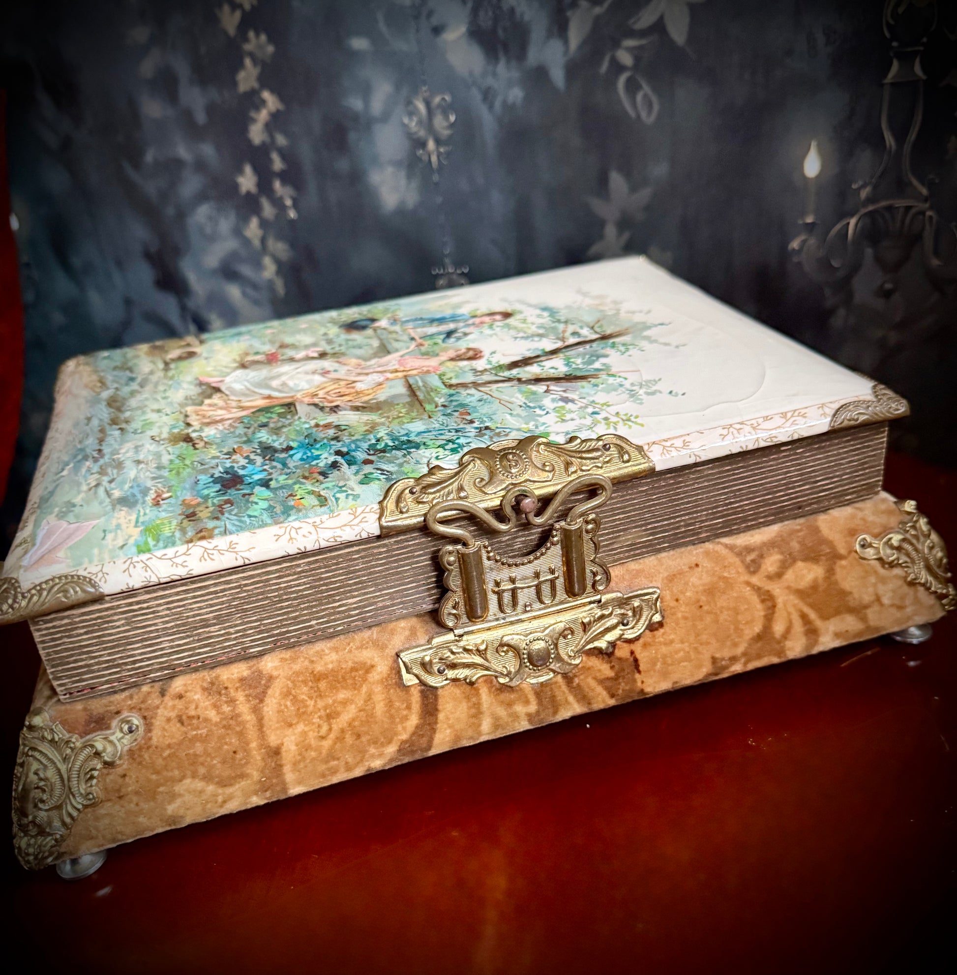 Late 19th-century celluloid-covered music box featuring a romantic pastoral scene on the lid, ornate gilt hardware, and rich velvet sides. The music box is still in working order, and tucked inside are four original vintage cabinet photographs.