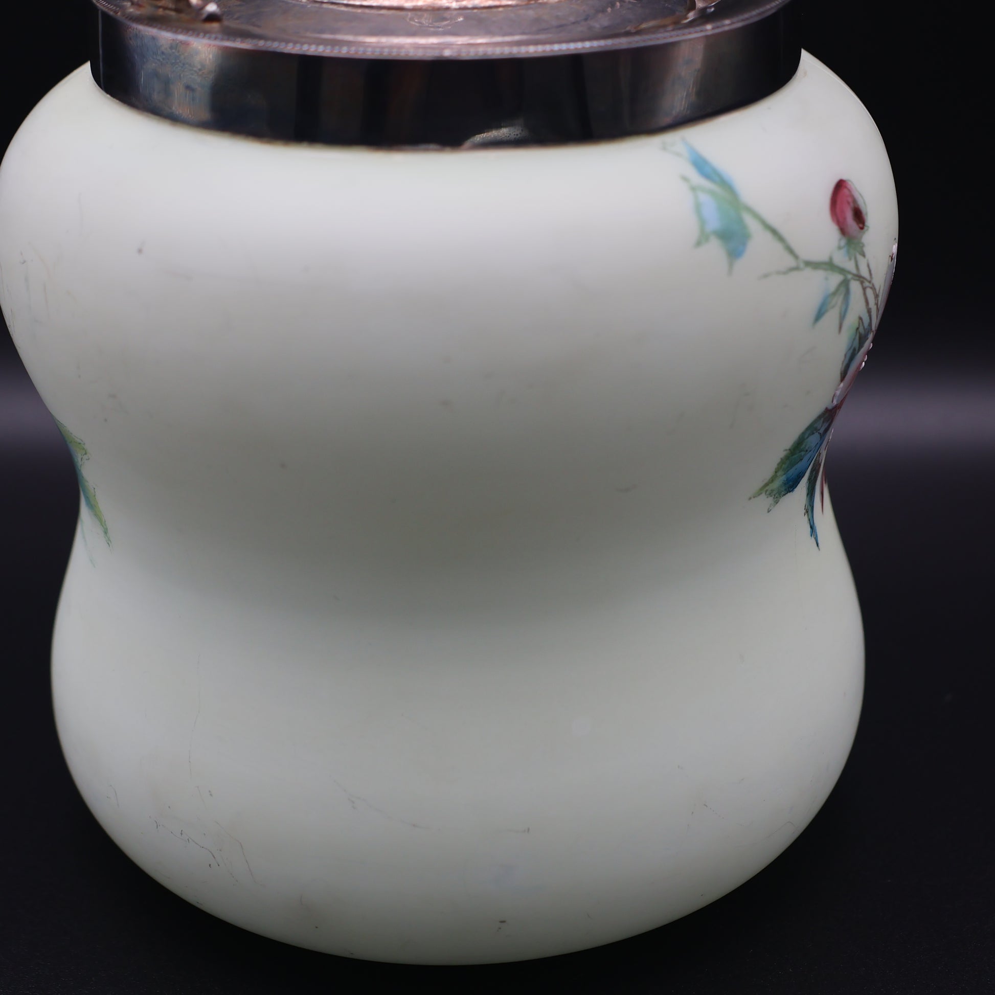 This charming antique biscuit jar features a softly curved Bristol-glass body with a beautiful hand-painted floral motif in pinks, blues, and greens. The surface has a satin, semi-opaque finish traditionally associated with Bristol and custard glass from the late Victorian period. The metal lid and swing handle add classic Victorian character, making it a lovely decorative accent for cottage-core, shabby chic, or vintage-inspired interiors.