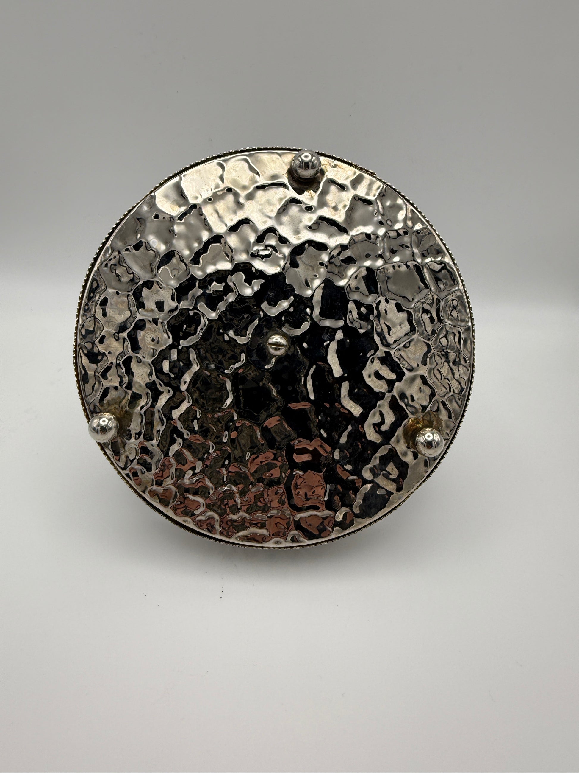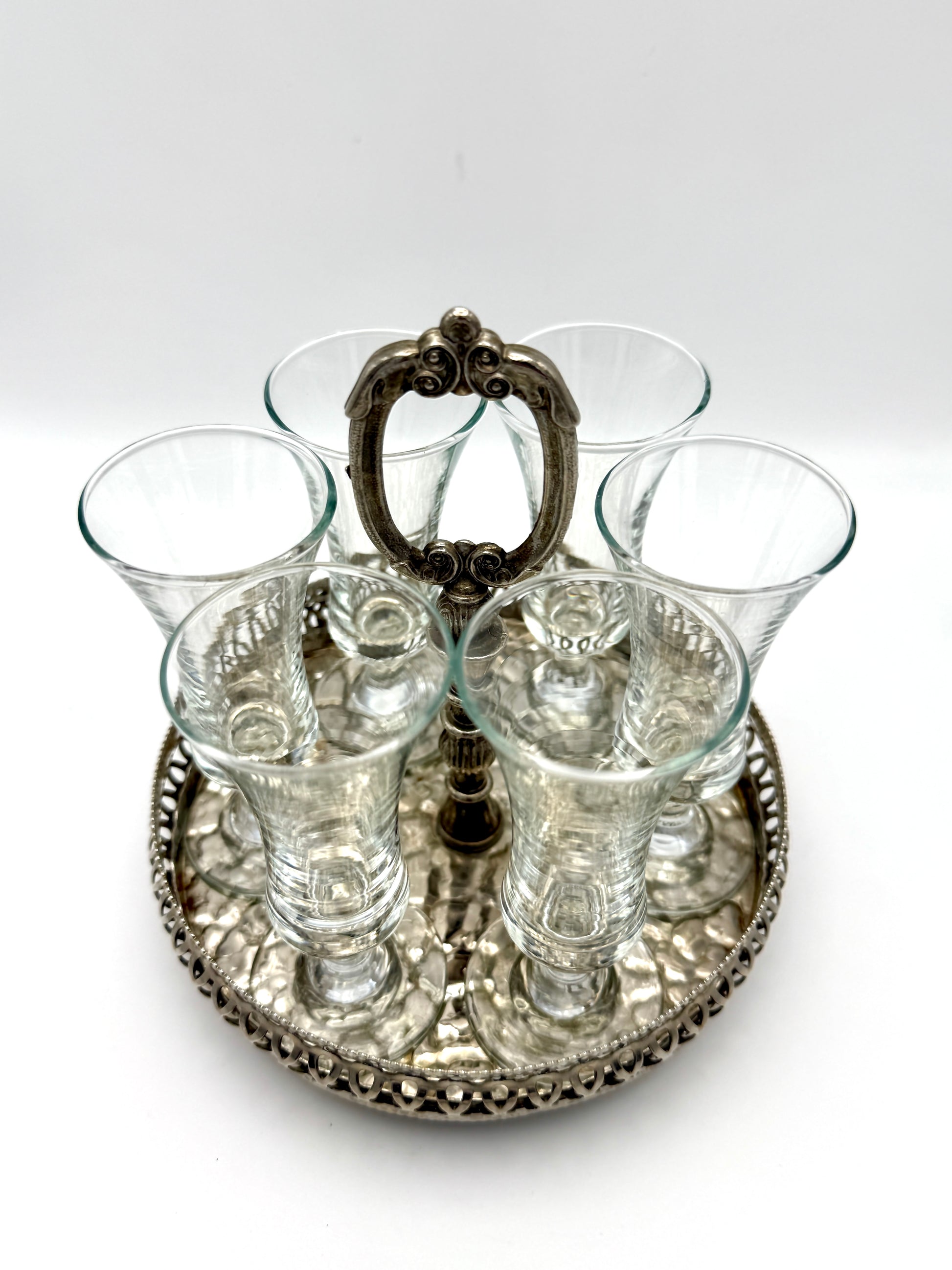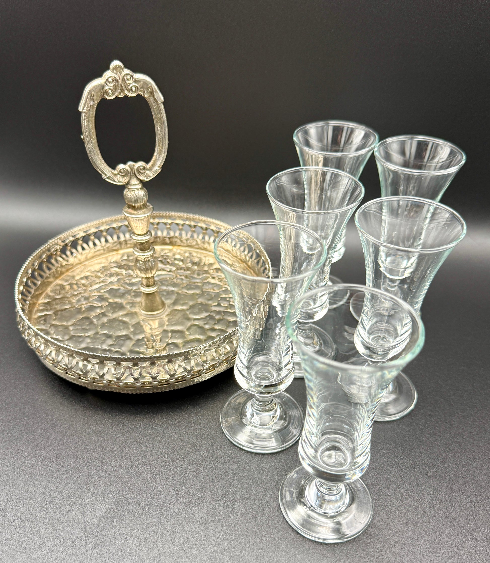 This set features six flared cordial glasses nested in a silver-plated tray with ornate pierced edging and a decorative central handle. The tray presents a gorgeous, bright-silver surface with a hand-hammered texture, traditional beaded rim, and classic mid-century detailing.