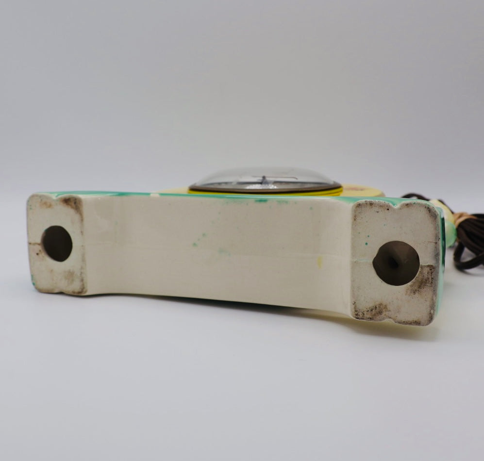 Charming and nostalgic vintage porcelain mantel clock featuring two hand-painted figures flanking an arched clock face decorated with floral motifs. The pastel yellow, green, and cream glaze is accented with gold gilt details, giving the piece a warm, storybook quality reminiscent of mid-century cottage and nursery décor.