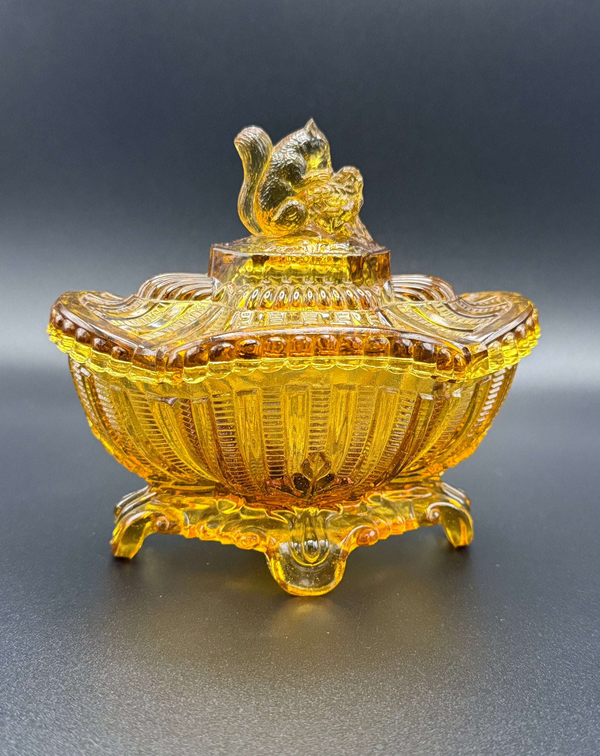 A charming vintage, amber glass, candy dish by Portieux Vallerysthal, featuring a beautifully detailed squirrel perched atop the lid. The ornate pressed glass design showcases the maker’s signature craftsmanship, with ribbed sides, scalloped edges, and an intricate pedestal base that glows warmly in the light.
