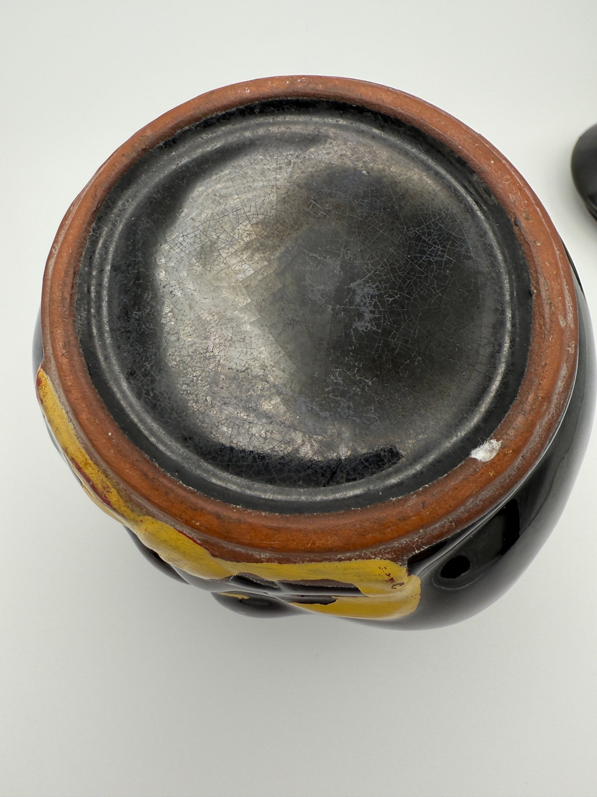 Handcrafted in Japan during the 1950s–1960s, this jar is made of redware pottery and finished with a glossy glaze. The figural design features a wide-eyed black cat with a cheerful yellow bow atop its head. Over time, some of the original paint has worn, revealing hints of the red underglaze, which is typical for Shafford’s hand-painted pottery and adds authentic vintage character.