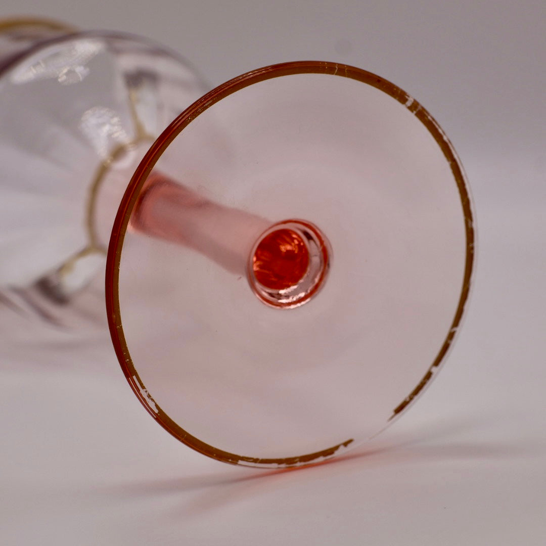 These larger-size goblets feature the iconic blush pink bowl, tall stem, and lavish gold-encrusted floral band that defines the Rambler Rose pattern. The thick floral gold band is typical of Tiffin’s luxury line, and the soft pink glass glows beautifully in any light. The large goblet size is highly desirable and less common than the cordial or 5" wine glasses.