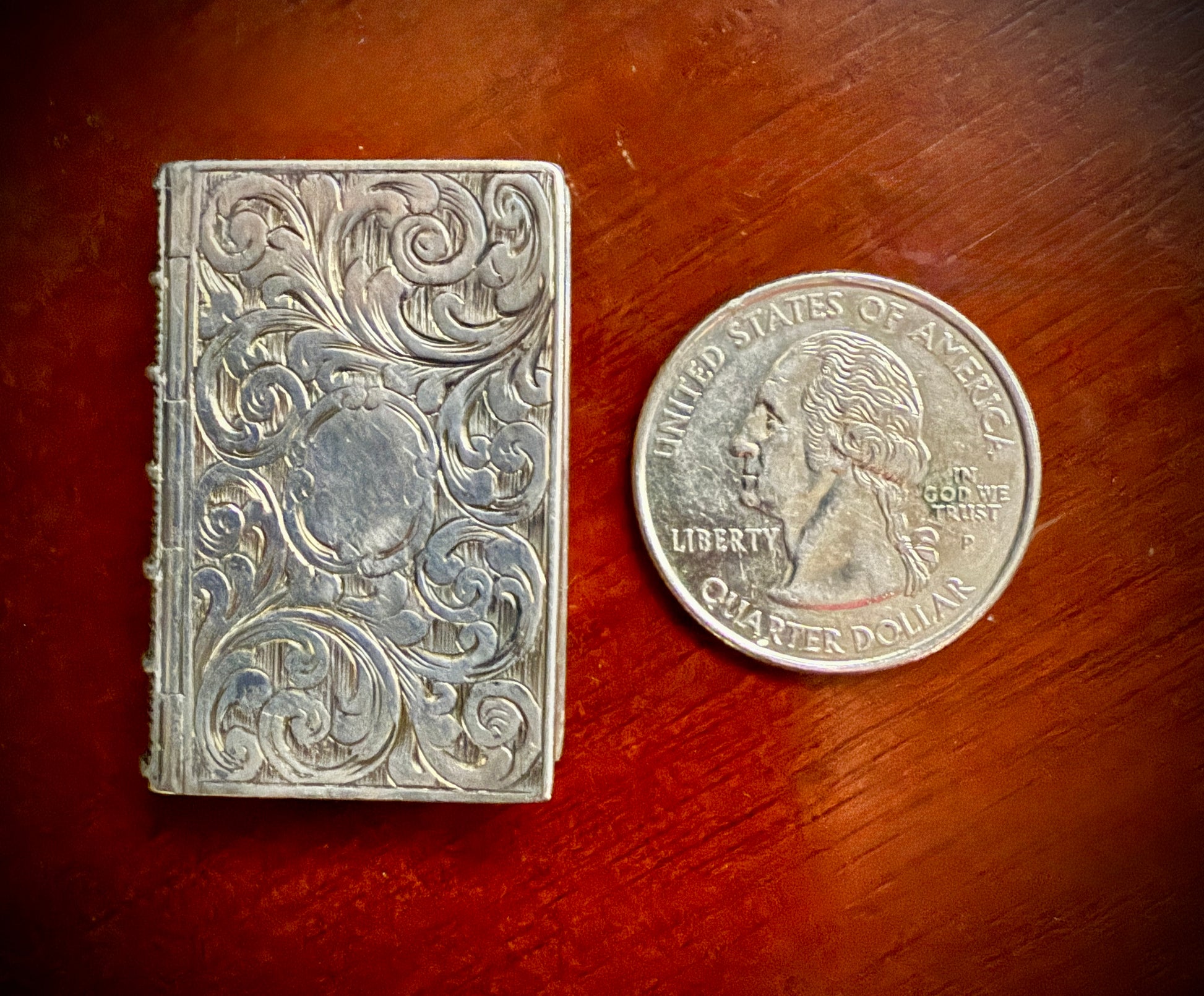 A beautifully preserved piece of high-Victorian craftsmanship, this English sterling silver vinaigrette is designed in the elegant form of a small book; an accessory once carried to mask city air and carriage smells with scented sponges or aromatic salts.