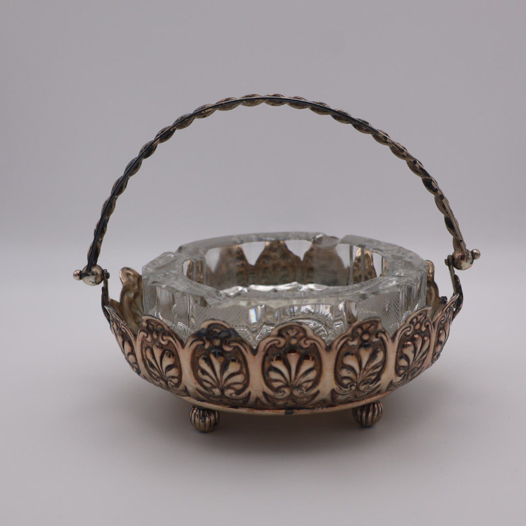 This unique vintage piece features a heavy glass (possibly lead crystal) ashtray paired with a footed metal basket. The basket is decorated with repeating leaf pattern and has a charming twisted handle that folds up and down. The ashtray may not have originally come with the basket, but it fits perfectly and pairs nicely.