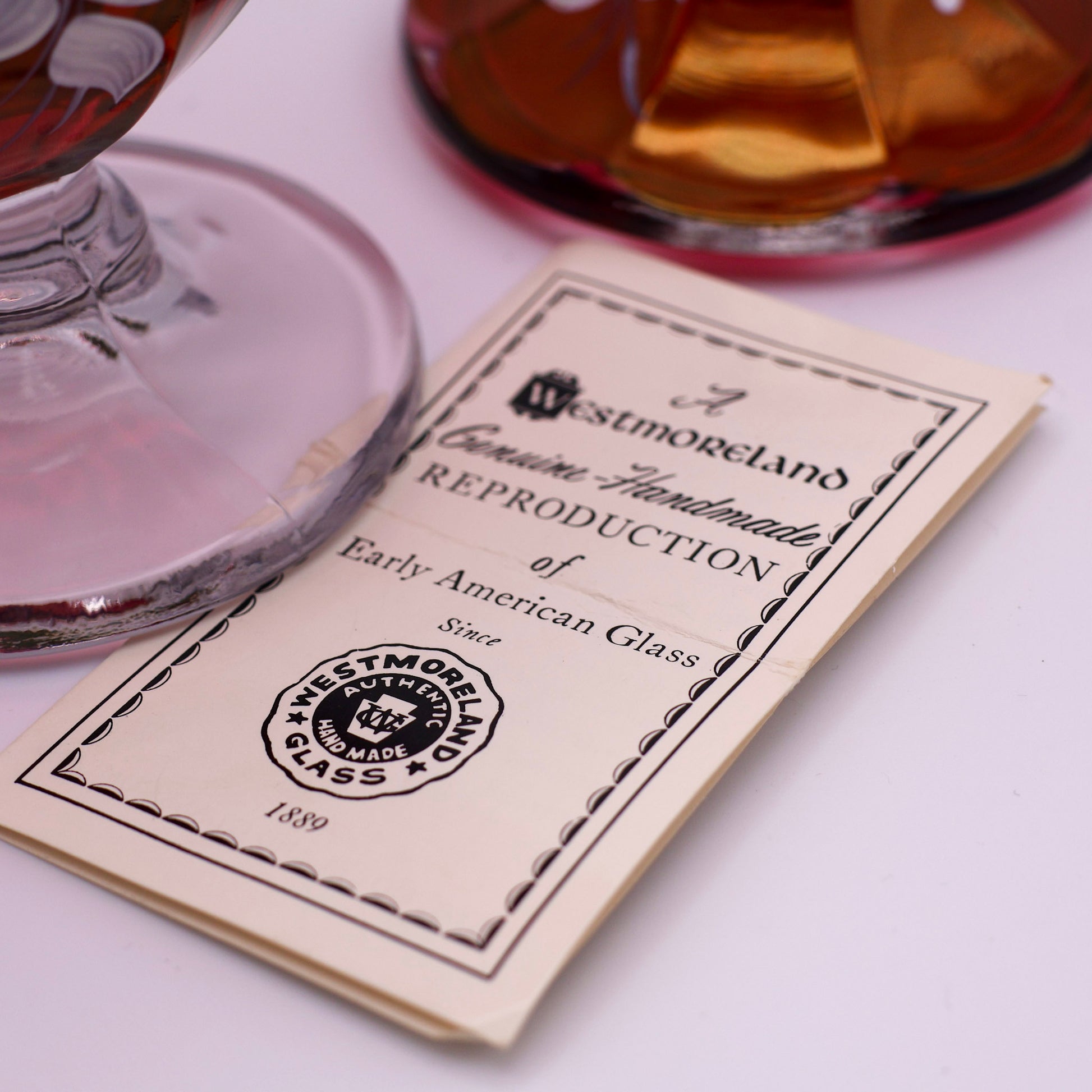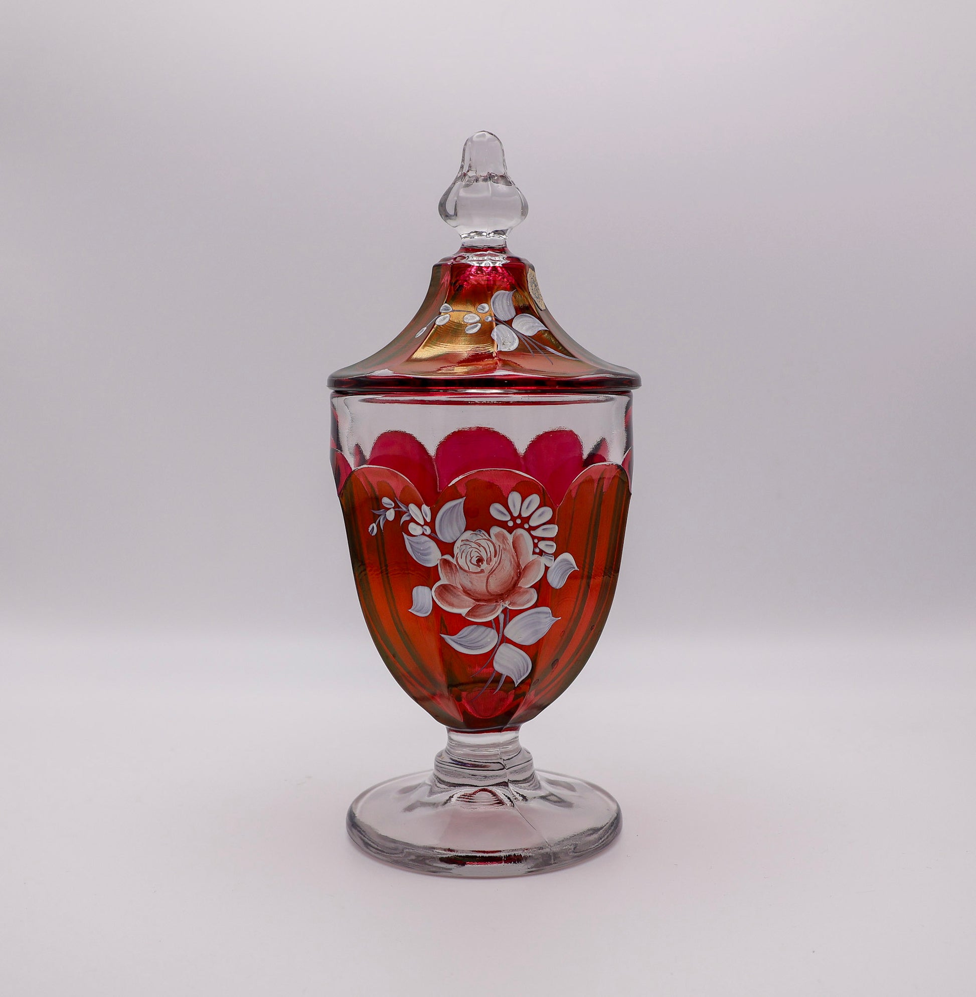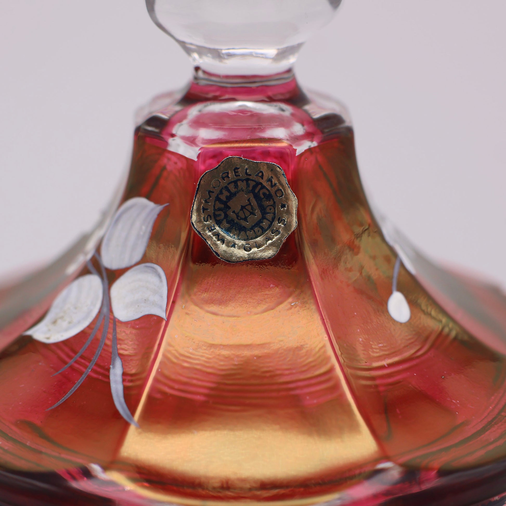 This elegant lidded candy jar was handcrafted by Westmoreland Glass Company in the 1970s. Made in the urn shape, it features rich ruby red flash glass with hand-painted white floral detailing and a clear pedestal base and finial. The lid is accented with matching ruby red and gold highlights, enhancing its Mid-Century Modern charm.